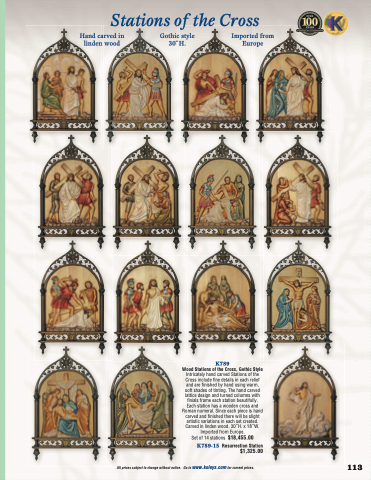 Intricately hand carved Stations of the Cross include fine details in each relief and are finished by hand using warm, soft shades of tinting. The hand carved lattice design and turned columns with finials frame each station beautifully. Each station has a wooden cross and Roman numeral. Since each piece is hand carved and finished there will be slight artistic variations in each set created. Carved in linden wood. 30˝ H. x 18˝ W. Imported from Europe.