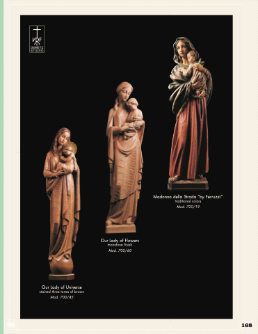Our Lady of Universe stained three tones of brown Mod. 700/45 Our Lady of Flowers monotone finish Mod. 700/60 Madonna della Strada “by Ferruzzi” traditional colors Mod. 700/19 168