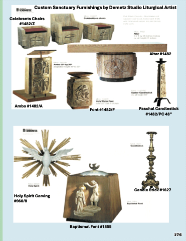 Celebrants Chairs #1482/Z Ambo #1482/A Font #1482/F Paschal Candlestick #1482/PC 48” Custom Sanctuary Furnishings by Demetz Studio Liturgical Artist Altar #1482 Holy Spirit Carving #960/8 Baptismal Font #1855 Candle Stick #1627 176