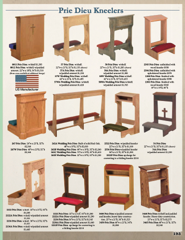 2304 Prie Dieu unfinished with upholstered kneeler $970 2300 Prie Dieu finished with upholstered kneeler $990 2301 Prie Dieu finished with wood kneeler $945