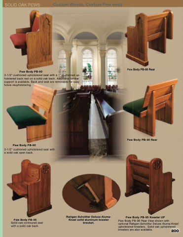 Pew Body PB-95 Rear View shown with optional Ratigan-Schottler Deluxe Aluma-Kneel upholstered kneelers. Solid oak upholstered kneelers are also available.