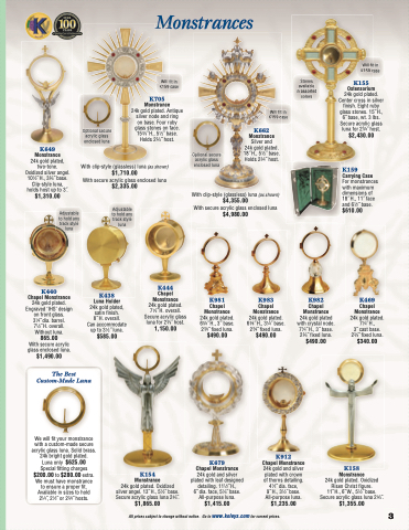 with a custom-made secure acrylic glass luna. Solid brass. 24k bright gold plated. Luna only $625.00 Special fitting charges $200.00 to $280.00 extra. We must have monstrance to ensure a proper fit. Available in sizes to hold 21⁄4˝, 21⁄2˝ or 23⁄4˝ hosts.