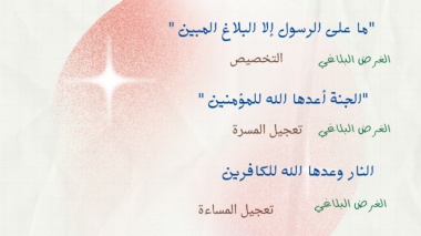 "ما على الرسول إلا البلاغ المبين " التخصيص الغرض البلاغي "الجنة أعدها الله للمؤمنين " الغرض البلاغي تعجيل المسرة النار وعدها الله للكافرين تعجيل المساءة الغرض البلاغي