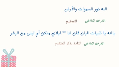 الله نور السموات والأرض الغرض البلاغي التعظيم بالله يا ظبيات البان قلن لنا ** ليلاي منكن أم ليلى من البشر الغرض البلاغي التلذذ بذكر المتقدم