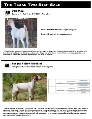 BV 152, Momma or momma! If you want one that’s just going to go lay out in the pasture and spit them out while doing her job all by herself? Well, this is your gal. Self-efficient and produced the top-selling wether this year at the ranch, and was the most talked about wether donor of our place. Check out that pedigree and watch her move. This momma's got all the goods to make you your next champion like she has before, and the bonus part is she does it all on her own. Sells exposed possibility bred for December kids. Mouth good, Teats 2x2, Pigment 65%