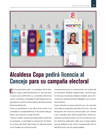 EEva Copa, solicitará licencia al Concejo Mu- la alcaldesa, Beatriz Zegarrundo, recordó que