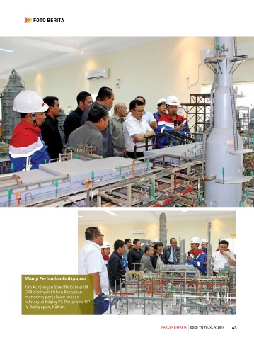 FOTO BERITA Kilang Pertamina Balikpapan Tim Kunjungan Spesifik Komisi VII DPR dipimpin Milton Pakpahan menerima penjelasan proses refinery di Kilang PT. Pertamina UP IV Balikpapan, Kaltim. PARLEMENTARIA EDISI 113 TH. XLIV, 2014 45