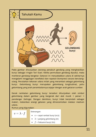 Tahukah KamuPada gambar ditunjukkan seorang penabuh gendang yang menghasilkanbunyi sebagai iringan Tari Guel. Ketika permukaan gendang dipukul, makamembran gendang bergetar. Getaran ini menyebabkan udara di sekitarnyamengalami renggangan (rarefaksi) dan rapatan (kompresi) secara berulangulang. Perubahan tekanan udara inilah yang merambat sebagai gelombangbunyi. Gelombang bunyi merupakan gelombang longitudinal, yaitugelombang yang arah perambatannya sejajar dengan arah getaran sumber.Gerak rambatan gelombang bunyi tersebut ditunjukkan oleh simbolgelombang dalam gambar yang bergerak dari alat musik %u2192 penari %u2192pendengar (telinga). Dengan demikian, bunyi tidak berpindah sebagaimateri, melainkan energi getaran yang ditransmisikan melalui mediumudara.Rumus yang digunakan:11