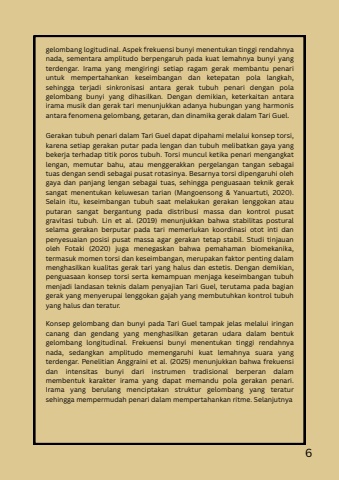 gelombang logitudinal. Aspek frekuensi bunyi menentukan tinggi rendahnyanada, sementara amplitudo berpengaruh pada kuat lemahnya bunyi yangterdengar. Irama yang mengiringi setiap ragam gerak membantu penariuntuk mempertahankan keseimbangan dan ketepatan pola langkah,sehingga terjadi sinkronisasi antara gerak tubuh penari dengan polagelombang bunyi yang dihasilkan. Dengan demikian, keterkaitan antarairama musik dan gerak tari menunjukkan adanya hubungan yang harmonisantara fenomena gelombang, getaran, dan dinamika gerak dalam Tari Guel.Gerakan tubuh penari dalam Tari Guel dapat dipahami melalui konsep torsi,karena setiap gerakan putar pada lengan dan tubuh melibatkan gaya yangbekerja terhadap titik poros tubuh. Torsi muncul ketika penari mengangkatlengan, memutar bahu, atau menggerakkan pergelangan tangan sebagaituas dengan sendi sebagai pusat rotasinya. Besarnya torsi dipengaruhi olehgaya dan panjang lengan sebagai tuas, sehingga penguasaan teknik geraksangat menentukan keluwesan tarian (Mangoensong & Yanuartuti, 2020).Selain itu, keseimbangan tubuh saat melakukan gerakan lenggokan atauputaran sangat bergantung pada distribusi massa dan kontrol pusatgravitasi tubuh. Lin et al. (2019) menunjukkan bahwa stabilitas posturalselama gerakan berputar pada tari memerlukan koordinasi otot inti danpenyesuaian posisi pusat massa agar gerakan tetap stabil. Studi tinjauanoleh Fotaki (2020) juga menegaskan bahwa pemahaman biomekanika,termasuk momen torsi dan keseimbangan, merupakan faktor penting dalammenghasilkan kualitas gerak tari yang halus dan estetis. Dengan demikian,penguasaan konsep torsi serta kemampuan menjaga keseimbangan tubuhmenjadi landasan teknis dalam penyajian Tari Guel, terutama pada bagiangerak yang menyerupai lenggokan gajah yang membutuhkan kontrol tubuhyang halus dan teratur.Konsep gelombang dan bunyi pada Tari Guel tampak jelas melalui iringancanang dan gendang yang menghasilkan getaran udara dalam bentukgelombang longitudinal. Frekuensi bunyi menentukan tinggi rendahnyanada, sedangkan amplitudo memengaruhi kuat lemahnya suara yangterdengar. Penelitian Anggraini et al. (2025) menunjukkan bahwa frekuensidan intensitas bunyi dari instrumen tradisional berperan dalammembentuk karakter irama yang dapat memandu pola gerakan penari.Irama yang berulang menciptakan struktur gelombang yang teratursehingga mempermudah penari dalam mempertahankan ritme. Selanjutnya6
