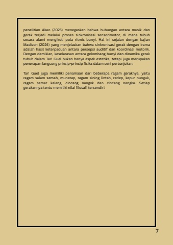 penelitian Akao (2025) menegaskan bahwa hubungan antara musik dangerak terjadi melalui proses sinkronisasi sensorimotor, di mana tubuhsecara alami mengikuti pola ritmis bunyi. Hal ini sejalan dengan kajianMadison (2024) yang menjelaskan bahwa sinkronisasi gerak dengan iramaadalah hasil keterpaduan antara persepsi auditif dan koordinasi motorik.Dengan demikian, keselarasan antara gelombang bunyi dan dinamika geraktubuh dalam Tari Guel bukan hanya aspek estetika, tetapi juga merupakanpenerapan langsung prinsip-prinsip fisika dalam seni pertunjukan.Tari Guel juga memiliki penamaan dari beberapa ragam geraknya, yaituragam salam semah, munatap, ragam sining lintah, redep, kepur nunguk,ragam semar kalang, cincang nangok dan cincang nangka. Setiapgerakannya tentu memiliki nilai filosafi tersendiri.7