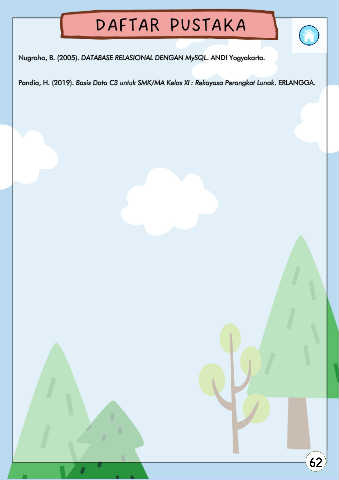 Nugroho, B. (2005). DATABASE RELASIONAL DENGAN MySQL. ANDI Yogyakarta. Pandia, H. (2019). Basis Data C3 untuk SMK/MA Kelas XI : Rekayasa Perangkat Lunak. ERLANGGA.