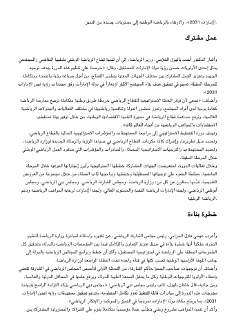 ﻟإ ﺔﻟوﺪﻟﺎﺑ ﺔﻴﺿﺎﻳﺮﻟا ﺲﻟﺎﺠﻤﻟا ﺞﻣاﺮﺑو ﻂﻄﺧ نأ ﺪﻛأو ،ﻞﺒﻘﺘﺴﻤﻟا ﺔﻴﺠﻴﺗاﺮﺘﺳا ﻓ ﺔﺿﺎﻳﺮﻟا ﻠﻋ ﺔﻘﻠﻌﻤﻟا تﺎﺣﻮﻤﻄﻟا