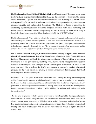 His Excellency Dr. Ahmad Belhoul Al Falasi, Minister of Sports, stated: “Investing in our youth