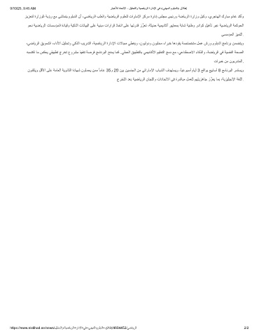 ،ﻲﺿﺎﯾرﻟا ﻖﯾوﺳﺗﻟا ،ءادﻷا لﯾﻠﺣﺗو ﻲﻛذﻟا بﯾردﺗﻟا ،ﺔﯾﺿﺎﯾرﻟا ةرادﻹا تﻻﺎﺟﻣ ﻲطﻐﯾو ،نوﯾﻟودو نوﯾﻠﺣﻣ ءارﺑﺧ ﺎھدوﻘﯾ ﺔﺻّﺻﺧﺗﻣ لﻣﻋ شرو موﻠﺑدﻟا ﺞﻣﺎﻧرﺑ نﻣﺿﺗﯾو