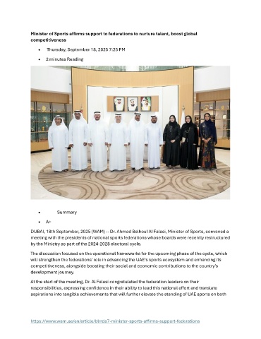 DUBAI, 18th September, 2025 (WAM) -- Dr. Ahmad Belhoul Al Falasi, Minister of Sports, convened a