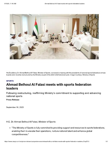 9/19/25, 11:06 AM Ahmad Belhoul Al Falasi meets with sports federation leaders
