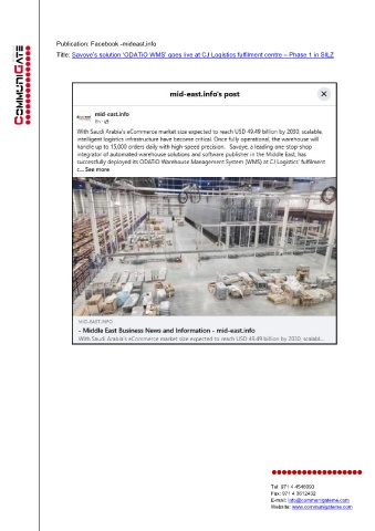 Publication: Facebook -mideast.info Title: Savoye’s solution ‘ODATiO WMS’ goes live at CJ Logistics fulfilment centre – Phase 1 in SILZ Tel: 971 4 4546093 Fax: 971 4 3612432 E-mail: info@communigateme.com Website: www.communigateme.com