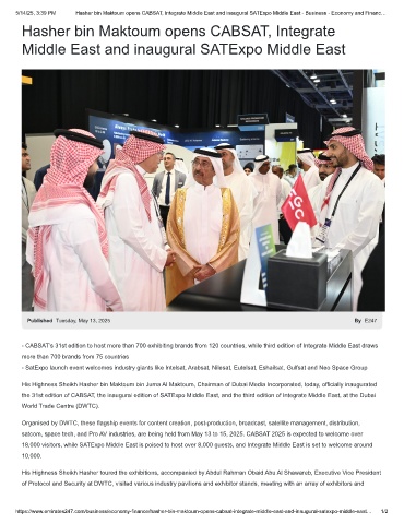 5/14/25, 3:39 PM Hasher bin Maktoum opens CABSAT, Integrate Middle East and inaugural SATExpo Middle East - Business - Economy and Financ…