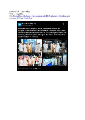 Publication: X – Media Office Date: 14 May 2025 Link: Media Office: Hasher bin Maktoum opens CABSAT, Integrate Middle East and inaugural SATExpo Middle East