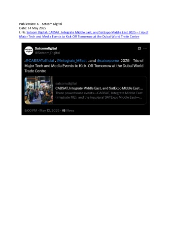Publication: X – Satcom Digital Date: 14 May 2025 Link: Satcom Digital: CABSAT, Integrate Middle East, and SatExpo Middle East 2025 – Trio of Major Tech and Media Events to Kick-Off Tomorrow at the Dubai World Trade Centre