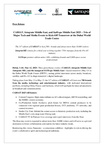 Dubai, UAE, May 12, 2025: Three powerhouse events—CABSAT, Integrate Middle East