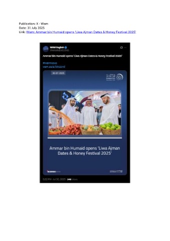 Publication: X - Wam Date: 31 July 2025 Link: Wam: Ammar bin Humaid opens 'Liwa Ajman Dates & Honey Festival 2025'