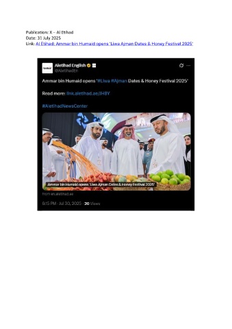 Publication: X – Al Etihad Date: 31 July 2025 Link: Al Etihad: Ammar bin Humaid opens 'Liwa Ajman Dates & Honey Festival 2025'