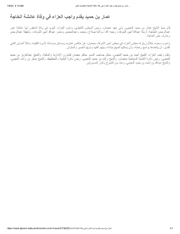 ﺮﻤﻋ ﺔﺸﺋﺎﻋ ﺎﮭﻟ رﻮﻔﻐﻤﻟا ةﺎﻓو ﻲﻓ ،مﻮﯿﻟا ،ءاﺰﻌﻟا ﺐﺟاو ،يﺬﯿﻔﻨﺘﻟا ﺲﻠﺠﻤﻟا ﺲﯿﺋر ،نﺎﻤﺠﻋ ﺪﮭﻋ ﻲﻟو ،ﻲﻤﯿﻌﻨﻟا ﺪﯿﻤﺣ ﻦﺑ رﺎّﻤﻋ ﺦﯿﺸﻟا ّ ﻮﻤﺳ مّﺪﻗ