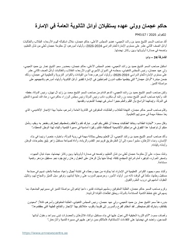 ةراملإا يف ةماعلا ةيوناثلا لئاوأ نلابقتسي هدهع يلوو نامجع مكاح