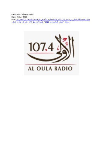 Publication: Al Oula Radio Date: 25 July 2025 Link: نع نامجع يف ةيحايسلا ةيمنتلا ةرئاد يف ءادلأا ريوطتو ةيجيتارتسلاا ةرادإ ريدم ،يشورطملا ناطلس ةدمح ثيدح ىلولأا ةعاذلإا ريثأ ىلع دلابلا لايع جمانرب ل ”2025 ماعل يحايسلا ركتبملا“ ةقباسم