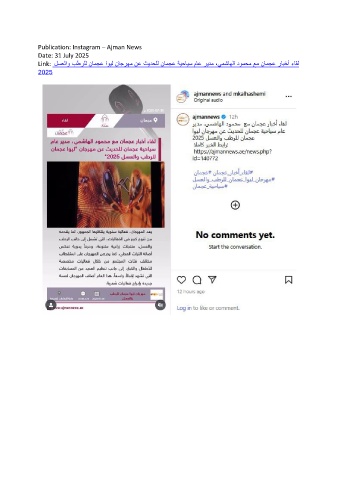 Publication: Instagram – Ajman News Date: 31 July 2025 Link: لسعلاو بطرلل نامجع اويل ناجرهم نع ثيدحلل نامجع ةيحايس ماع ريدم ،يمشاهلا دومحم عم نامجع رابخأ ءاقل 2025