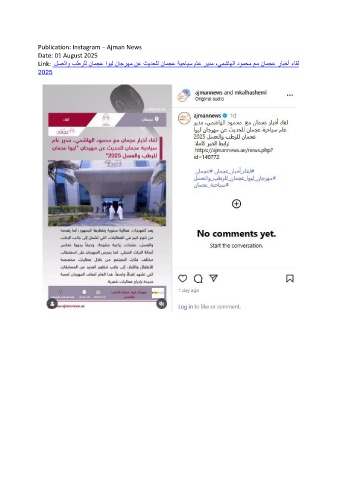 Publication: Instagram – Ajman News Date: 01 August 2025 Link: لسعلاو بطرلل نامجع اويل ناجرهم نع ثيدحلل نامجع ةيحايس ماع ريدم ،يمشاهلا دومحم عم نامجع رابخأ ءاقل 2025