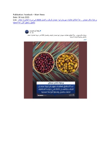 Publication: Facebook – Wam News Date: 30 July 2025 Link: ءافتحا ،ةرشاعلا هترود يف 2025 لسعلاو بطرلل نامجع اويل ناجرهم تايلاعف قلاطنا ًادغ .. نامجع مكاح ةياعرب ةيلحملا ةعارزلل ًازيفحتو ليخنلاب