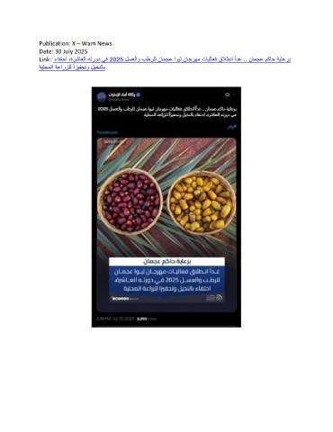 Publication: X – Wam News Date: 30 July 2025 Link: ءافتحا ،ةرشاعلا هترود يف 2025 لسعلاو بطرلل نامجع اويل ناجرهم تايلاعف قلاطنا ًادغ .. نامجع مكاح ةياعرب ةيلحملا ةعارزلل ًازيفحتو ليخنلاب