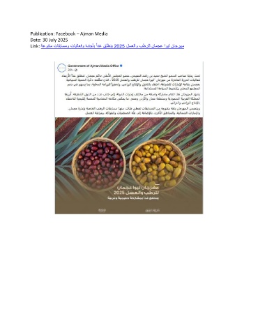 Publication: Facebook – Ajman Media Date: 30 July 2025 Link: ةعونتم تاقباسمو تايلاعفو ةدنجأب ًادغ قلطني 2025 لسعلاو بطرلل نامجع اويل ناجرهم