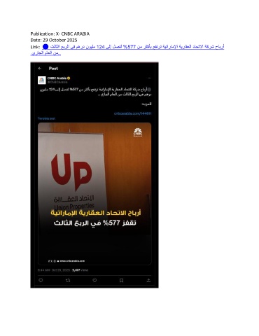 Publication: X- CNBC ARABIA Date: 29 October 2025 Link: ⚫ ثلاثلا عبرلا يف مهرد نويلم 124 ىلإ لصتل %577 نم رثكأب عفترت ةيتاراملإا ةيراقعلا داحتلاا ةكرش حابرأ يراجلا ماعلا نم..