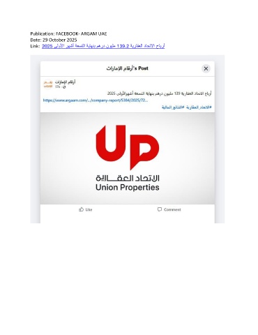 Publication: FACEBOOK- ARGAM UAE Date: 29 October 2025 Link: 2025 ىلولأا رهشأ ةعستلا ةياهنب مهرد نويلم 139.2 ةيراقعلا داحتلاا حابرأ