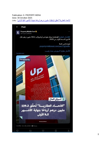 Publication: X- PROPERTY MENA Date: 30 October 2025 Link: " ىلولأا 9ـلا رهشلأا ةياهنب اًحابرأ مهرد نويلم 139.2 قِّقحُت "ةيراقعلا داحتلاا 3