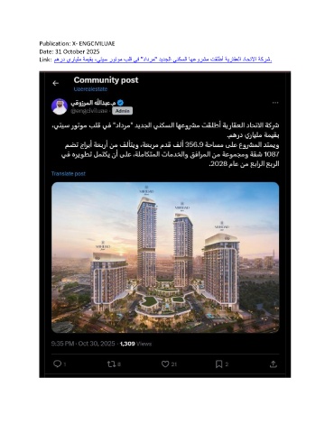 Publication: X- ENGCIVILUAE Date: 31 October 2025 Link: مهرد يرايلم ةميقب ،يتيس روتوم بلق يف "دادرم" ديدجلا ينكسلا اهعورشم تقلطأ ةيراقعلا داحتلاا ةكرش.