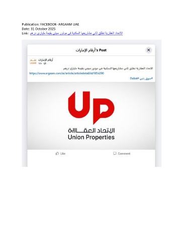 Publication: FACEBOOK- ARGAAM UAE Date: 31 October 2025 Link: مهرد يرايلم ةميقب يتيس روتوم يف ةينكسلا اهعيراشم يناث قلطت ةيراقعلا داحتلاا