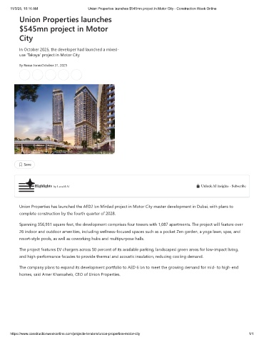11/3/25, 10:16 AM Union Properties launches $545mn project in Motor City - Construction Week Online