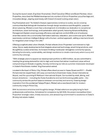 Properties, described the Mirdad development as a symbol of Union Properties' proud heritage and