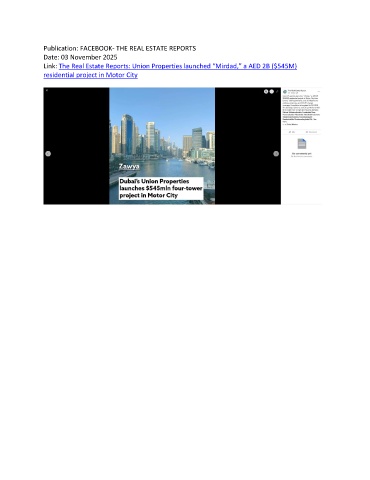 Publication: FACEBOOK- THE REAL ESTATE REPORTS Date: 03 November 2025 Link: The Real Estate Reports: Union Properties launched “Mirdad,” a AED 2B ($545M) residential project in Motor City