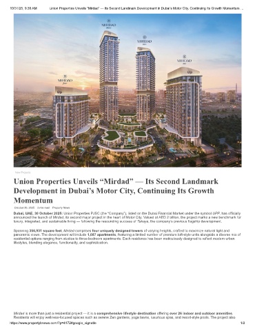 10/31/25, 9:30 AM Union Properties Unveils “Mirdad” — Its Second Landmark Development in Dubai’s Motor City, Continuing Its Growth Momentum …