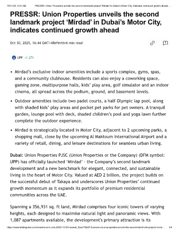 10/31/25, 9:34 AM PRESSR: Union Properties unveils the second landmark project ‘Mirdad’ in Dubai’s Motor City, indicates continued growth ahead …