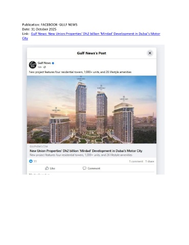 Publication: FACEBOOK- GULF NEWS Date: 31 October 2025 Link: Gulf News: New Union Properties' Dh2 billion ‘Mirdad’ Development in Dubai’s Motor City