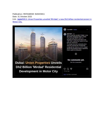 Publication: INSTAGRAM- ISAM45811 Date: 31 October 2025 Link: isam45811: Union Properties unveiled 'Mirdad,' a new Dh2 billion residential project in Motor City.