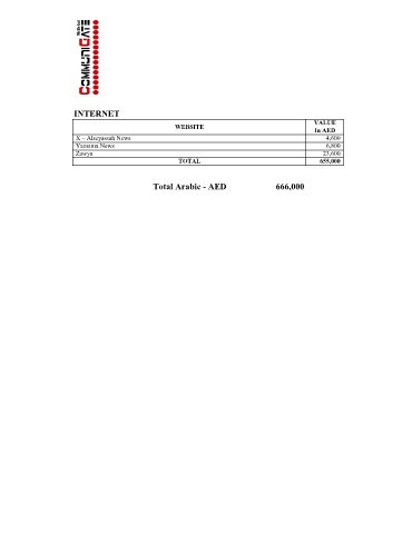 INTERNET VALUE WEBSITE In AED X–AlseyassahNews 4,600 Yamama News 6,800 Zawya 23,600 TOTAL 655,000 Total Arabic - AED 666,000