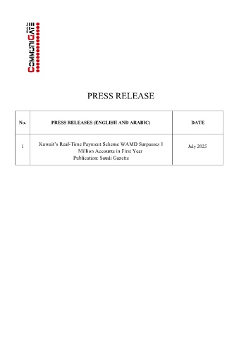 PRESS RELEASE No. PRESS RELEASES (ENGLISH AND ARABIC) DATE 1 Kuwait’s Real-Time Payment Scheme WAMD Surpasses 1 July 2025 Million Accounts in First Year Publication: Saudi Gazette