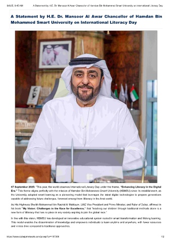 9/8/25, 9:45 AM A Statement by H.E. Dr. Mansoor Al Awar Chancellor of Hamdan Bin Mohammed Smart University on International Literacy Day